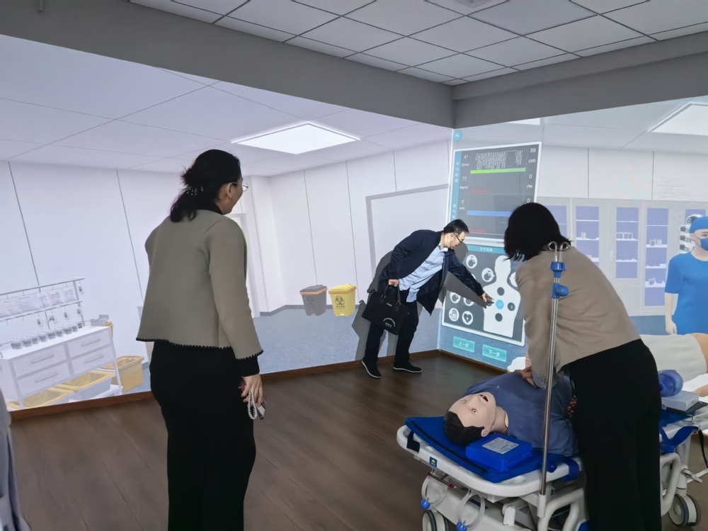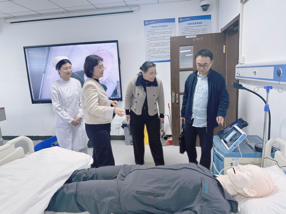 考察团一行实地参观了护理实验教学与技能训练中心,重点考察了虚拟仿真教学系统、虚实结合模拟实训平台等智慧化教学手段在安宁疗护培训中的实际应用。葛海燕科长对学院在安宁疗护人才培养、课程创新、智慧化教学平台建设等方面取得的成效给予高度评价,认为学院具备建设高水平安宁疗护培训基地的良好基础和独特优势。